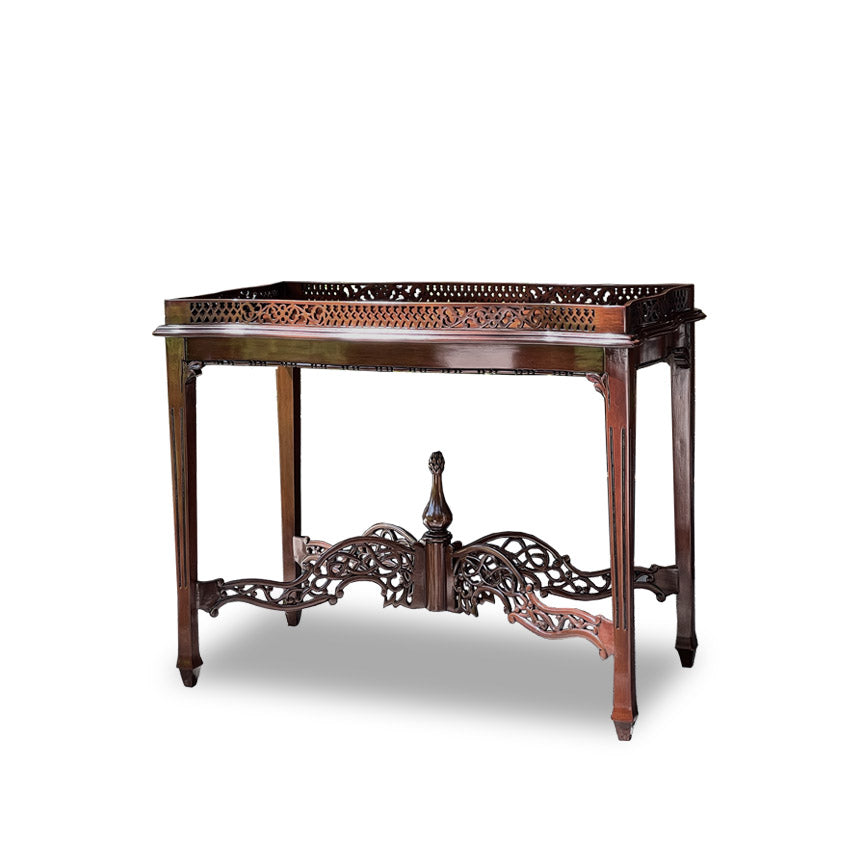 At Thomas & George, we handcraft fine furniture in our local workshop. Elegant, timeless, and rich in detail, our Chinese Chippendale Tea Table captures the graceful sophistication of 18th-century design. Featuring the signature fretwork lattice patterns and refined lines of the Chippendale style, this piece blends Eastern-inspired ornamentation with classic Western furniture form. Whether placed beside a tufted chair or paired with other chinoiserie elements, this tea table adds architectural charm and historic character to any interior.