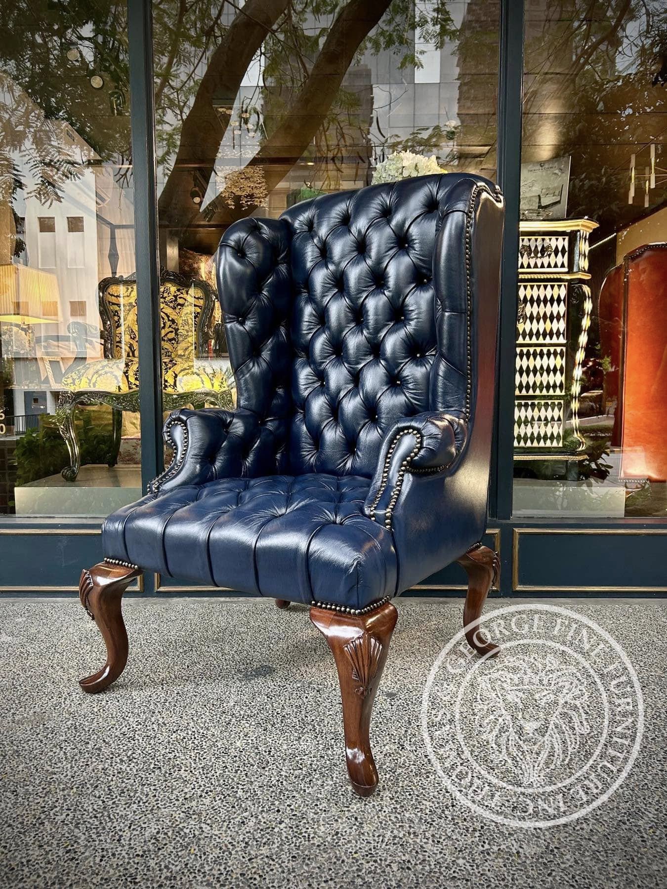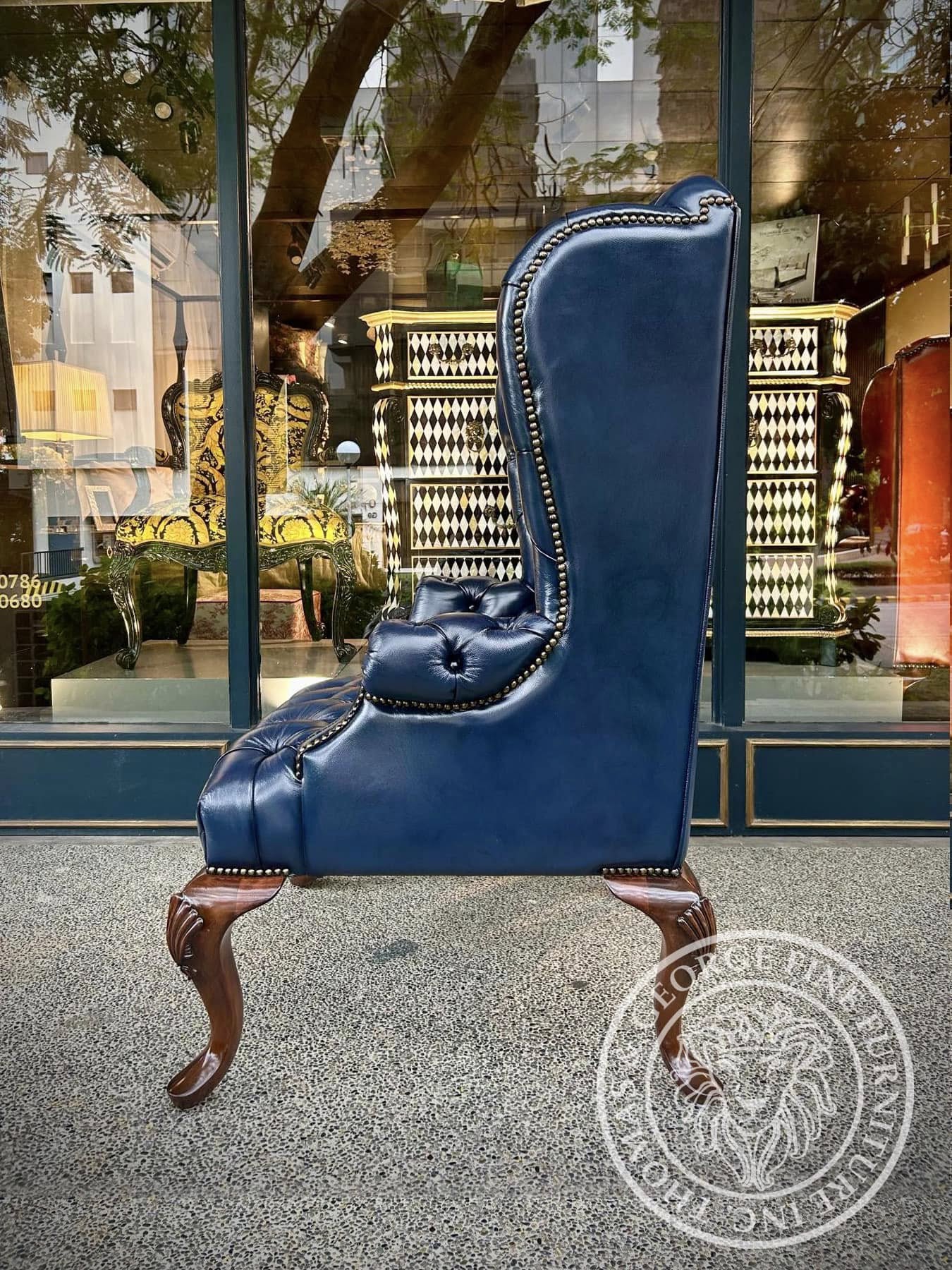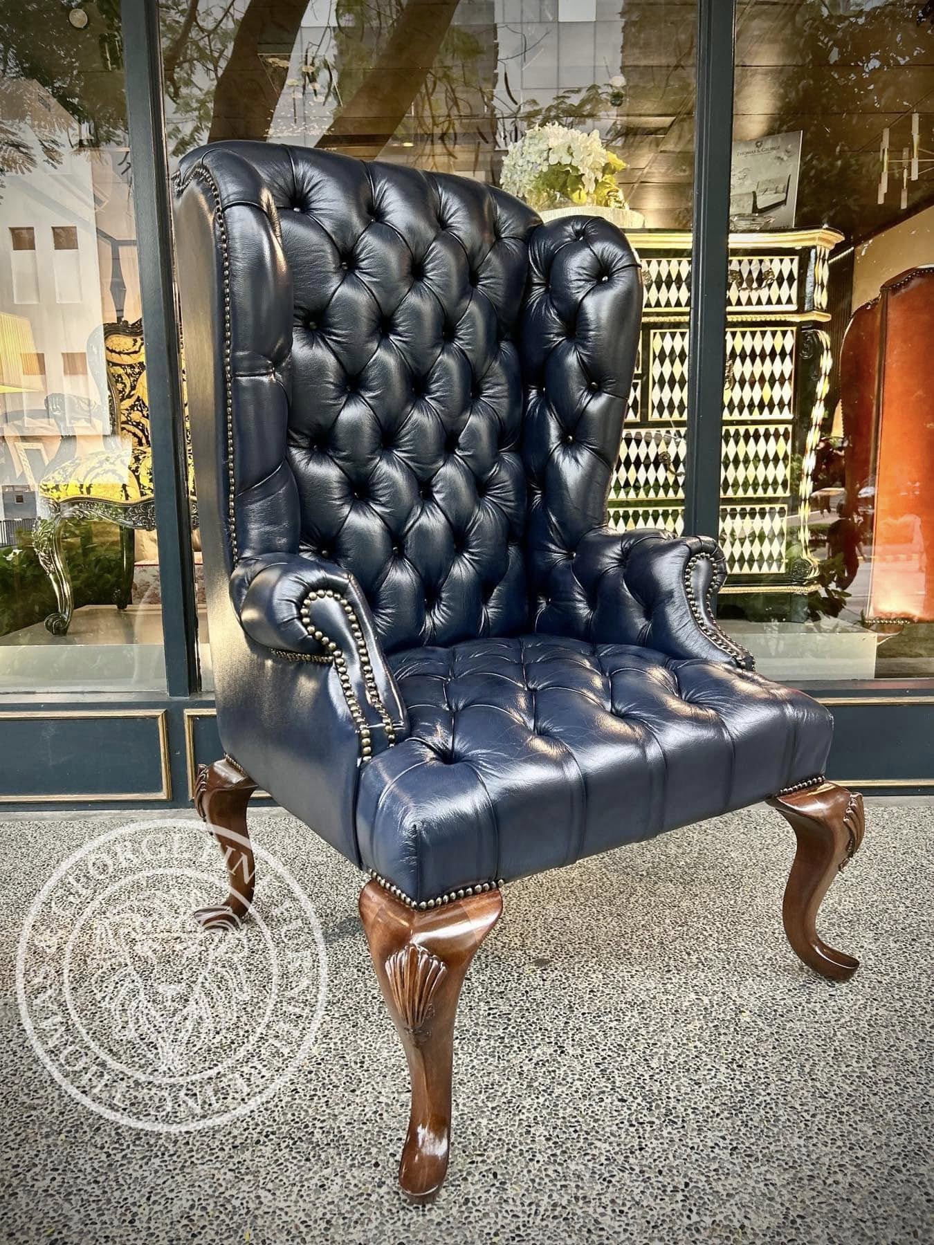 At Thomas & George, we handcraft fine furniture in our local workshop. Inspired by 18th-century English design, this Queen Anne Wing Chair blends timeless elegance with modern craftsmanship. Made by skilled artisans, it features a high back, winged sides, scrolled arms, and hand-carved cabriole legs—all anchored by a solid wood frame for lasting strength. Upholstered in your choice of imported genuine cowhide leather, it is available in a range of rich colors and finishes. Whether in a formal living room or refined reading nook, this heirloom-quality chair is built to endure—an antique of tomorrow, made with care today. .